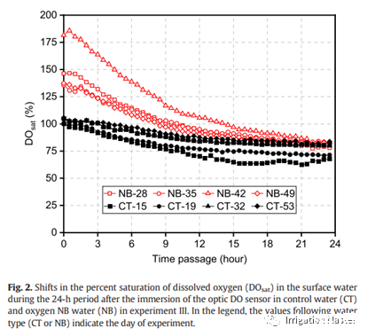 對照水中的DOsat(DO的飽和度百分比)隨時間逐漸降低,并在每次測量15小時后達到最小值(圖2)。在對照水中,有四次收斂的DOsat水平隨時間增加。在含氧納米氣泡水中,DOsat在8.5-14.5 h內降至飽和水平(即100%),并在24 h內收斂至約80%。含氧納米氣泡水的初始DOsat通常不高(DO=11.5–15.2 mg L-1),部分原因是納米氣泡生成后2小時內暴露于空氣中。