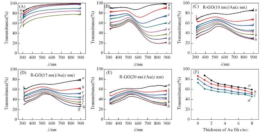 在可見光波段(400——750 nm)的透過率是評判透明電極的重要指標(biāo)之一。為了考察R-GO/Au微電極的光學(xué)性能,首先測量了GO、R-GO薄膜以及不同厚度的Au薄膜在可見光波段的透過率,結(jié)果如圖3(A)和(B)所示。厚度分別為10,15和20 nm的GO薄膜具有很高的透過率,在可見光波段的透過率大于90%.盡管經(jīng)過肼蒸汽還原后R-GO薄膜的透過率有所下降,但是10 nm厚的R-GO薄膜在可見光波段的透過率仍然大于80%.從Au薄膜的透過率曲線可以看出,超薄Au薄膜在可見光波段透過率較高,隨著Au厚度的增加其透過率逐漸下降。圖3(C)——(E)給出了不同R-GO和Au厚度的R-GO/Au復(fù)合電極的透過率曲線,為了避免微圖案化陣列對電極透過率的影響,在表征復(fù)合電極透過率的過程中采用大面積無微圖案化的R-GO/Au樣品。圖3(F)給出R-GO、Au以及R-GO/Au復(fù)合薄膜在550 nm波長下的透過率。可以看出,與R-GO薄膜以及Au薄膜相比,復(fù)合電極的透過率有所下降,并且與R-GO以及Au的厚度有直接的關(guān)聯(lián),以R-GO(10 nm)/Au(4 nm)樣品為例,其對550 nm波長光的透過率為70%,這樣較高的透過率可以滿足透明/半透明電極的要求。如果進一步考慮微圖案化陣列對微電極透過率的影響,可以預(yù)期R-GO/Au復(fù)合微電極陣列整體在可見光波段具有更高的透過率。
