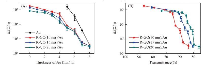 利用四探針測量電阻的方法對R-GO/Au復(fù)合微電極的電學(xué)性能進行了評估,測試了R-GO/Au復(fù)合微電極在不同R-GO和Au厚度時的表面電阻(Rs),結(jié)果如圖4(A)所示。在R-GO電極上引入Au薄膜可以有效提高其導(dǎo)電性,并且Rs與復(fù)合電極薄膜的厚度緊密相關(guān),隨著R-GO和Au厚度的增加,Rs迅速降低,當(dāng)復(fù)合電極中R-GO和Au的厚度分別為20和7 nm時,復(fù)合電極的Rs約為35Ω/□。單獨的Au薄膜由于在沉積過程中按照“Volmer-Weber”模式生長,形成不連續(xù)的島狀結(jié)構(gòu),所以在只有幾納米厚的條件下,其電阻率非常大。從圖4(A)中可以看出,在厚度小于5 nm時,Au薄膜幾乎不導(dǎo)電,5 nm厚的Au薄膜的表面電阻Rs平均約為17 kΩ/□,而5 nm的Au與R-GO復(fù)合電極的Rs約為0.5 kΩ/□,Rs(Au)比Rs(R-GO/Au)高2個數(shù)量級;雖然增加Au薄膜的厚度可以有效地減少Rs(Au),但是Rs(Au)依舊比Rs(R-GO/Au)高1——2個數(shù)量級,直到Au的厚度增加到8 nm以上時,Rs(Au)與Rs(R-GO/Au)才比較相近。圖4(B)給出了R-GO/Au復(fù)合電極的表面電阻和透過率的關(guān)系曲線,根據(jù)實際器件中透明電極對表面電阻和透過率的需求,結(jié)合圖4(B)可以對復(fù)合電極各層的厚度進行設(shè)計。