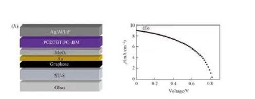 為了進一步對R-GO/Au復(fù)合微電極陣列的光電性能進行評估,利用復(fù)合微電極陣列作為半透明陽極制備了OPVs,器件結(jié)構(gòu)為復(fù)合微電極陣列/MoO3/PCDTBT∶PC71BM/LiF/Al/Ag[如圖5(A)所示].采用的復(fù)合微電極陣列中R-GO的厚度為10 nm,Au的厚度為7 nm,相應(yīng)復(fù)合電極的表面電阻為56Ω/□,對于550 nm波長光的透過率為59%.對制備的基于R-GO/Au復(fù)合微電極陣列的OPVs器件的性能進行了表征[圖5(B)],器件的開路電壓為0.82 V,短路電流密度為9.05 mA/cm2,填充因子為46.31%,光電轉(zhuǎn)換效率為3.43%.由實驗結(jié)果可以看出,所制備的周期性R-GO/Au復(fù)合微電極陣列具有較好的光電性能,能夠滿足透明電極的要求,可以應(yīng)用于微器件中。