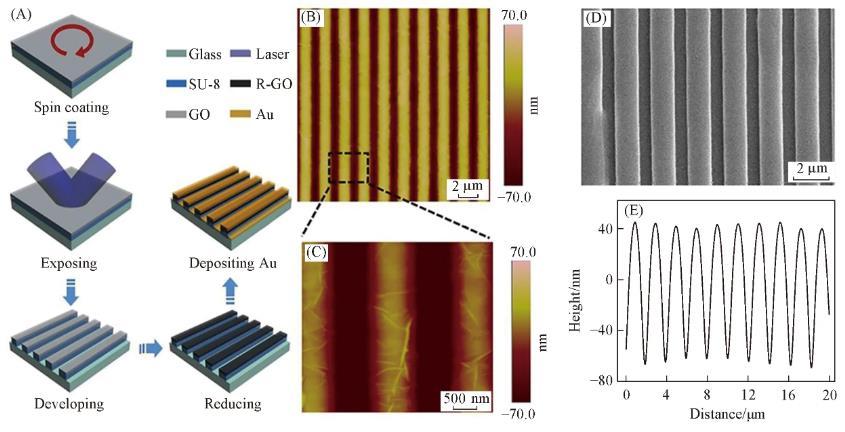 利用雙光束干涉~無掩模光刻技術(shù)制備R-GO/Au復(fù)合微電極陣列,工藝過程如圖1(A)所示。利用兩束波長為266 nm的激光干涉形成的場強周期性變化的光場對SU-8/GO結(jié)構(gòu)進行曝光。由于SU-8具有光敏特性,在紫外曝光時會發(fā)生交聯(lián),因此代表光場強弱變化的周期性條紋被SU-8層所記錄,在經(jīng)歷顯影工藝過程之后,未曝光部分的SU-8攜帶其上層覆蓋的GO被去除,從而獲得與干涉圖樣相對應(yīng)的周期性GO陣列。通過改變兩束相干光之間的夾角可以有效地控制所制備的GO陣列的周期。利用肼蒸汽對制備的GO陣列進行脫氧還原,從而獲得R-GO陣列。為了進一步提高R-GO微電極的導(dǎo)電性,利用物理氣相沉積工藝在微電極表面蒸鍍一層超薄Au薄膜。在蒸鍍Au薄膜之前,R-GO微結(jié)構(gòu)之間的凹槽處為裸露的玻璃襯底,在蒸鍍Au薄膜的過程中,由于Au與玻璃襯底之間表面能的失配,沉積在R-GO條紋之間的超薄Au薄膜按照“Volmer-Weber”生長模式形成不連續(xù)的島狀結(jié)構(gòu),其導(dǎo)電性很差,與R-GO/Au復(fù)合薄膜相比,其導(dǎo)電性可以忽略。因此在本實驗中,不考慮微結(jié)構(gòu)之間凹槽處的超薄Au薄膜對R-GO/Au復(fù)合微電極陣列的影響。
