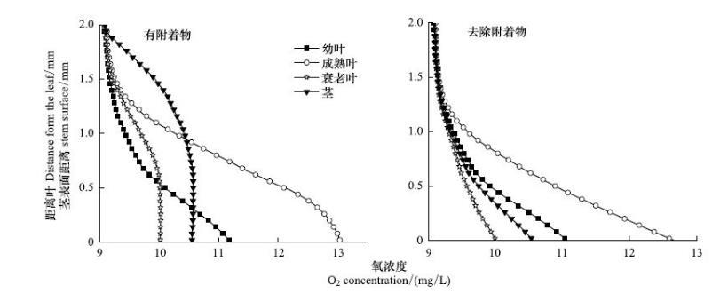 不同部位微界面O2的分布顯著不同(圖5)。幼葉由于光合活性較弱和附著物較少,O2隨距葉面距離的減小而增加,但增加幅度相對較小,葉面O2濃度為(11.21±0.22)mg/L。而成熟葉微界面中,O2濃度梯度增加幅度最大,進入附著層后O2增加幅度顯著降低,但由于成熟葉較強的光合活性和附著層的屏障作用,O2在附著層內(nèi)繼續(xù)增大,在葉表面O2濃度達到最大值(13.05±0.61)mg/L。衰老葉和莖微界面中,離附著物越近O2濃度越高,在附著物表面達到最大值,分別為(10.02±0.10)mg/L,(10.55±0.30)mg/L,進入附著層后,O2濃度略呈下降趨勢。去除附著物后莖葉微界面O2分布發(fā)生了明顯變化。莖葉表面O2濃度明顯降低,幼葉和成熟葉表面O2濃度分別降至11.07和12.67mg/L(圖5)。衰老葉和莖由于去除了較厚的附著物呈逐漸增加的趨勢。