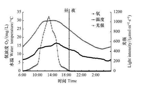 菹草葉表面O2存在明顯的晝夜變化,呈晝高夜低的單峰變化趨勢(圖4)。受光照和溫度的影響,白天,日出后O2濃度隨光照的增強持續(xù)升高,至15:00達到全天高峰16.68mg/L,此后O2濃度隨光照減弱持續(xù)下降,日落后,O2濃度繼續(xù)下降,至日出前5:10降至全天最低6.01mg/L。日出后,O2濃度又持續(xù)回升。
