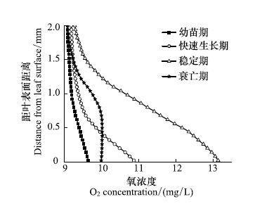 在菹草生命周期內(nèi),不同階段菹草葉微界面O2濃度梯度具明顯的變化(圖3)。幼苗期,菹草葉微界面O2濃度隨距葉面距離的減小而顯著增加,但增加幅度較小(葉表面O2濃度為(9.65±0.04)mg/L);進入快速生長期,葉微界面O2濃度梯度顯著增大(葉表面O2濃度為(10.90±0.21)mg/L);穩(wěn)定期,葉微界面O2濃度梯度隨距離減小而增加幅度最大,葉表面O2濃度達到生命周內(nèi)最大((13.16±0.40)mg/L)。衰亡期,葉微界面O2濃度增加幅度較小,但由于附著層較厚,影響了O2分布的趨勢,進入附著層后O2增加幅度顯著降低甚至出現(xiàn)了O2降低的現(xiàn)象。