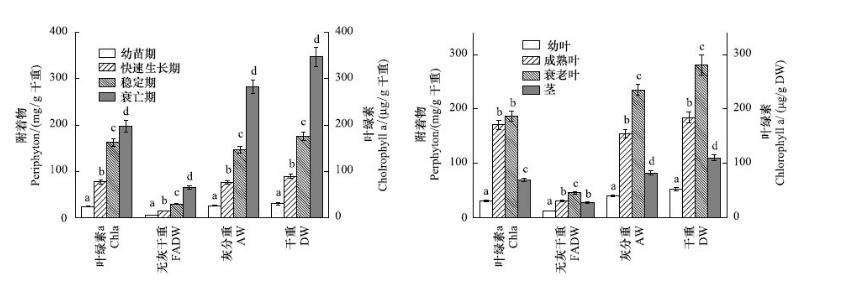 在菹草生命周期內(nèi),自幼苗期,隨著菹草的生長,附著在其葉表面的附著物持續(xù)增加(圖2),到衰亡期附著量達到最大。附著物葉綠素a含量、干重、灰分重和無灰分干重在菹草幼苗期、快速生長期、穩(wěn)定期和衰亡期均存在顯著差異(圖2)。處于穩(wěn)定期的成熟菹草,幼葉、成熟葉、衰老葉附著物量依次增加,而莖附著物量介于幼葉和成熟葉的之間。除附著物葉綠素a含量外,幼葉、成熟葉、衰老葉和莖附著物的干重、灰分重和無灰干重均存在顯著差異(圖2)。