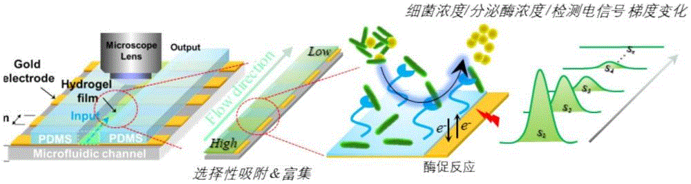 優(yōu)選的,所述高通量電化學(xué)梯度擴(kuò)散快速檢測細(xì)菌微流控裝置進(jìn)行細(xì)菌的電化學(xué)梯度傳感和快速檢測的具體方法為:將細(xì)菌樣品流入微流通道中進(jìn)行梯度擴(kuò)散0.5~10min,用于進(jìn)行細(xì)菌的梯度擴(kuò)散快速檢測;清洗后再通入濃度0.1%~8%的葡萄糖溶液,進(jìn)行微電極陣列的電流信號檢測實現(xiàn)對細(xì)菌濃度檢測,同時通過電流的梯度變化率,對檢測結(jié)果進(jìn)行矯正和驗證。