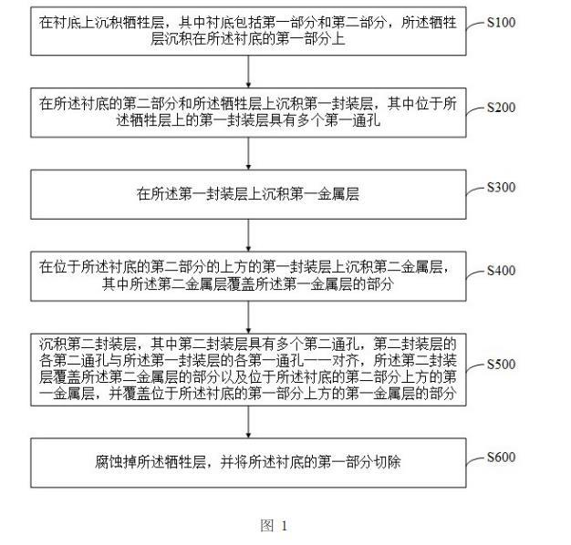 S200:在所述襯底的第二部分和所述犧牲層上沉積第一封裝層,其中位于所述犧牲層上的第一封裝層具有多個第一通孔;