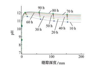如圖2和圖3所示,縫隙中每個點的pH隨著時間的延長而增加,在施加極化電流后的5 h之內,溶液的pH迅速從6.8升高到10以上;隨著時間的繼續延長,溶液pH逐漸穩定。溶液pH隨縫隙深度的增加而升高,約100 h后其pH穩定在12左右,在距離縫口約15 mm處溶液pH出現峰值。