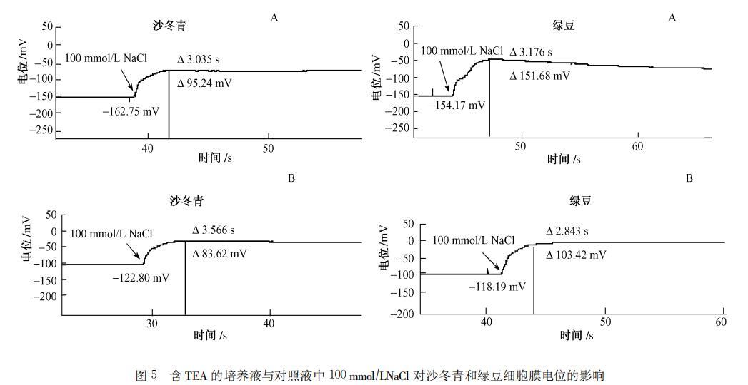 圖5含TEA的培養液與對照液中100mmol/LNaC1對沙冬青和綠豆細胞膜電位的影響