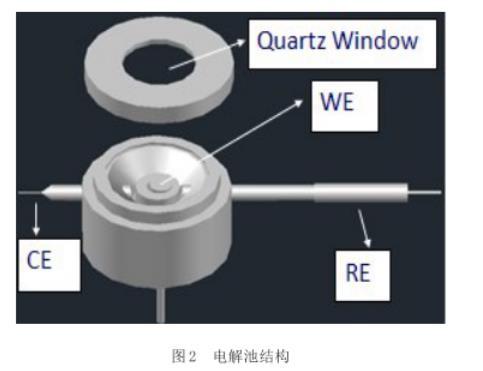 在本實驗中,我們使用三電極體系電解池,其構造如圖2所示,整個電解池除電極的金屬部分全部是由耐高溫的聚四氟乙烯制成,具有不易腐蝕、性質穩定、和抗老化等優良特性。系統下端為工作電極,左邊為對電極,右邊為參比電極以及石英窗組成。在實驗過程中,石英窗既可以防止電解液外漏,又不會對激光造成干擾。在本次實驗中,參比電極為銀/氯化銀電極,鉑絲作為對比電極。我們選擇銀制工作電極作為載體,在銀電極的表面均勻旋涂適量的金納米片,自然干燥后金納米片和銀表面緊密結合且可以導電,就得到了金納米片微電極。