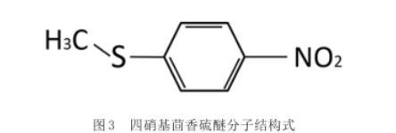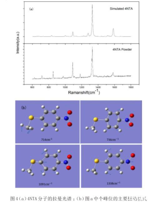 圖3是4NTA的結構圖,我們可以看到它是由一個苯環、一個硝基和一個S-CH3組成的,且兩個基團對位。由于金材料的吸收光譜的吸收峰位置接近785nm,所以我們選擇785nm激光器進行了拉曼光譜測量。我們將4NTA固體粉末的拉曼光譜圖和4NTA模擬拉曼光譜圖進行了比較,如圖4(a),測量中激光絕對功率為0.57mW,模擬光譜使用Gaussian09軟件中密度泛函理論,高斯軟件設置基組為6-31G(d),計算函數為B3LYP。理論計算顯示在1091cm-1,1338cm-1和1582cm-1處的三個強拉曼峰以及在低頻區在714cm-1處和736cm-1處的拉曼峰,結果顯示模擬光譜和實測光譜高度對應。4NTA的拉曼峰在1338cm-1最強,代表的是4NTA中C-NO2鍵的伸縮振動模式。在714cm-1處的振動模式歸因于S-CH3拉伸模式。在1091cm-1附近的兩個拉曼峰歸屬于苯環中H的對稱和反對稱振動模式。具體的振動模式如圖4(b)所示。