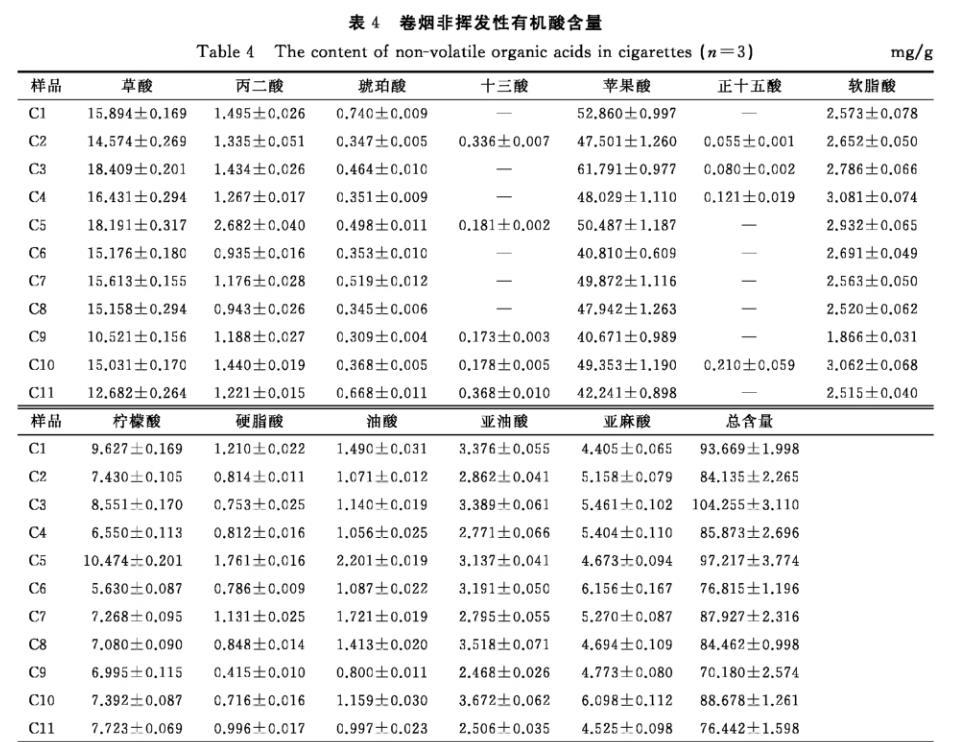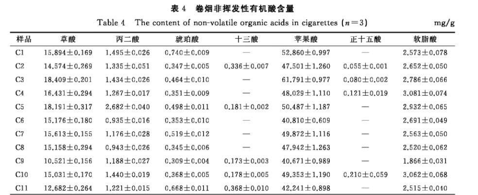 1.2.1非揮發性有機酸的測定參照邱寶平等的方法,對單料煙及卷煙非揮發性有機酸進行測定,每個樣品平行測定3次。