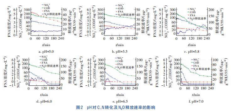 彭永臻等的研究表明,pH對于以NO2-為電子受體的反硝化過程影響顯著,除pH本身外,產(chǎn)生的FNA也會影響C、N的轉(zhuǎn)化特性。由圖3還可以發(fā)現(xiàn),當(dāng)pH由7.0降至5.0時,NO2-還原速率大幅降低,表明在酸性條件下NIR活性受到抑制,且pH越低抑制程度越嚴(yán)重。同時,酸性條件下NO2-的積累產(chǎn)生了較高濃度的FNA,然而N2O的釋放量和轉(zhuǎn)化率并未隨著pH的降低呈單向升高的趨勢,因此pH低于5.8時,很可能是pH及FNA對NOR的抑制更嚴(yán)重,導(dǎo)致N2O凈產(chǎn)量下降。有研究報道,在以NO2-為電子受體時,F(xiàn)NA是N2O還原酶的主要抑制劑。因此,分析相同pH、不同F(xiàn)NA濃度條件下NO2-還原及N2O釋放特征有助于探明FNA對NO2-型反硝化的影響。