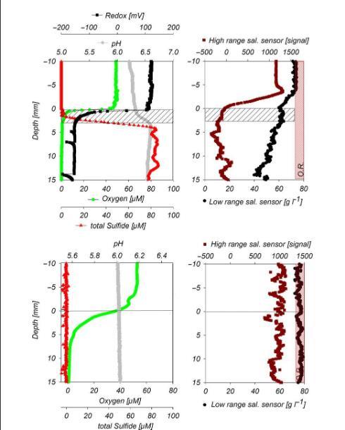 圖4、在WhMat1微生物群落中原位測量的微傳感器剖面(a和b)和死海參考站點(c和d)。陰影區域(a和b)對應微生物群落的位置,而線條(c和d)表示沉積物表面。低鹽度傳感器僅能測量高達70 g L 1的鹽度,超過這個鹽度會超出范圍。