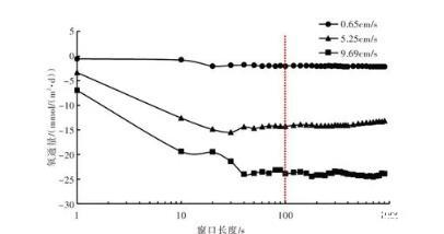 湍流紊動(dòng)值計(jì)算采用滑動(dòng)平均法,該方法中滑動(dòng)平均窗口長(zhǎng)度的選取對(duì)氧通量的計(jì)算結(jié)果影響很大,當(dāng)選取的窗口長(zhǎng)度過(guò)小,會(huì)排除大尺度的紊動(dòng),造成通量低估;當(dāng)選取的窗口長(zhǎng)度過(guò)大,會(huì)引入非穩(wěn)定成分,使得氧通量出現(xiàn)波動(dòng)。為確定合適的窗口長(zhǎng)度,將初始窗口長(zhǎng)度設(shè)為1 s,計(jì)算該窗口長(zhǎng)度下氧通量,之后逐漸增加窗口長(zhǎng)度,重復(fù)進(jìn)行上述步驟,獲得不同窗口長(zhǎng)度下的氧通量,當(dāng)通量達(dá)到穩(wěn)定時(shí)所對(duì)應(yīng)的窗口長(zhǎng)度即為合適的窗口長(zhǎng)度,計(jì)算過(guò)程如圖5所示。可以看出,當(dāng)窗口長(zhǎng)度為100 s時(shí),不同水平流速下的氧通量均可保持穩(wěn)定,因此本次試驗(yàn)選取100 s作為最終窗口長(zhǎng)度。
