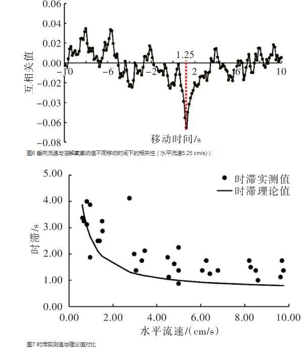 由于氧通量結(jié)果對(duì)時(shí)滯取值較為敏感,而理論時(shí)滯與實(shí)際情況存在一定偏差,因此實(shí)際應(yīng)用較少采用理論值。本文參照Lorrai等的方法確定實(shí)際時(shí)滯大小,首先參照相關(guān)研究中時(shí)滯大小,確定時(shí)滯的取值為10 s,接著將溶解氧紊動(dòng)值相對(duì)于垂向流速紊動(dòng)值的時(shí)間序列進(jìn)行移動(dòng),并計(jì)算兩者的相關(guān)性,時(shí)滯即為最大相關(guān)性所對(duì)應(yīng)的移動(dòng)時(shí)間。利用Matlab軟件中的xcorr函數(shù)進(jìn)行時(shí)滯校正。圖6為水平流速5.25 cm/s下垂向流速與溶解氧紊動(dòng)值相關(guān)性隨移動(dòng)時(shí)間的變化情況,可以看出,當(dāng)移動(dòng)時(shí)間為1.25 s時(shí),溶解氧和垂向流速紊動(dòng)值的相關(guān)性最大,因此該水平流速下的時(shí)滯為1.25 s。采用相同方法,將不同水平流速下時(shí)滯的實(shí)測(cè)值與理論值進(jìn)行分析(圖7),可以看出,時(shí)滯隨水平流速的增大而減小且與理論值擬合情況良好。說(shuō)明理論時(shí)滯雖與實(shí)際情況存在一定偏差,但在實(shí)際應(yīng)用中可以根據(jù)流速條件得到理論時(shí)滯值后,為時(shí)滯取值范圍的確定提供參考。
