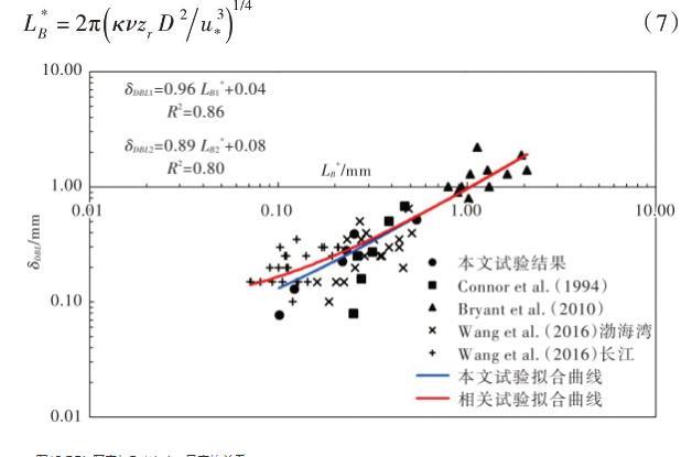 為分析水動(dòng)力條件對(duì)DBL厚度的影響,將DBL厚度與Batchelor尺度進(jìn)行線性擬合(圖10,藍(lán)色擬合線),可以看出,DBL厚度隨Batchelor尺度的增大線性增大,兩者呈顯著正相關(guān)關(guān)系,擬合關(guān)系式為δDBL1=0.96L*B1+0.04,相關(guān)系數(shù)為0.86。由于Batchelor尺度可以表征湍擴(kuò)散作用下標(biāo)量波動(dòng)所能保持的最小長(zhǎng)度尺度,因此上述擬合關(guān)系式表明水動(dòng)力條件對(duì)DBL厚度影響顯著。考慮到DBL厚度較難直接測(cè)量,而計(jì)算Batchelor尺度的相關(guān)參數(shù)較容易獲取,因此對(duì)DBL厚度進(jìn)行參數(shù)化描述。整理相關(guān)試驗(yàn)結(jié)果并根據(jù)式(7)得到Batchelor尺度。將相關(guān)試驗(yàn)中DBL厚度與Batchelor尺度關(guān)系進(jìn)行線性擬合(圖10,紅色擬合線),可以看出,本文和相關(guān)試驗(yàn)擬合曲線較為一致,擬合關(guān)系式為δDBL2=0.89L*B2+0.08,相關(guān)系數(shù)為0.80。考慮到相關(guān)研究中未對(duì)影響運(yùn)動(dòng)黏滯系數(shù)和分子擴(kuò)散系數(shù)的水溫條件進(jìn)行實(shí)時(shí)觀測(cè),因此Batchelor尺度計(jì)算值與實(shí)際情況可能存在偏差。但整體而言,本文與相關(guān)試驗(yàn)結(jié)果擬合公式中的參數(shù)非常接近,兩擬合公式均說(shuō)明Batch?elor尺度與DBL厚度基本呈正相關(guān)關(guān)系(相關(guān)系數(shù)約為0.9),因此在實(shí)際應(yīng)用中可用Batchelor尺度近似表示DBL厚度。