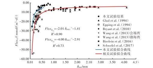 為進(jìn)一步研究DBL厚度對(duì)氧通量的影響,將本文氧通量與DBL厚度進(jìn)行線性擬合(圖11,藍(lán)色擬合線)。可以看出,氧通量隨DBL厚度的減小線性增大,兩者呈現(xiàn)負(fù)相關(guān)關(guān)系,擬合關(guān)系式為,相關(guān)系數(shù)為0.90,說(shuō)明氧通量與DBL厚度變化密切相關(guān)。整理相關(guān)研究中氧通量與DBL厚度并進(jìn)行線性擬合(圖11,紅色擬合線),擬合關(guān)系式為相關(guān)系數(shù)為0.73。對(duì)比兩擬合曲線,發(fā)現(xiàn)本文試驗(yàn)擬合曲線略高于相關(guān)試驗(yàn)擬合曲線,這可能是由于室內(nèi)試驗(yàn)過(guò)程中排除了生物活動(dòng)的影響所致。但整體而言,兩條擬合曲線的變化趨勢(shì)較為一致:當(dāng)DBL厚度小于0.5 mm左右時(shí),DBL厚度變化對(duì)氧通量影響更強(qiáng)烈,氧通量隨DBL厚度減小迅速增大;DBL大于0.5 mm左右時(shí),氧通量基本保持穩(wěn)定。本文試驗(yàn)的DBL厚度范圍為0.08~0.52 mm,最大DBL厚度對(duì)應(yīng)的水平流速為0.65 cm/s,結(jié)合Glud等的試驗(yàn)結(jié)果,可以說(shuō)明DBL厚度大于0.5 mm左右時(shí),氧通量基本保持不變。