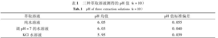 由于超純水中的離子濃度非常低,在測超純水的pH時,電極的結構性能會引起電極液接界電位的不穩定,加上超純水的無緩沖性能和空氣中CO2溶入等,這些因素導致在檢測超純水的pH時會有反應慢,示值漂移的現象。有文獻報道在被測水樣中加入KCl溶液作為離子強度調節劑,改變溶液中的離子總強度,增加導電性,能使測量快速穩定。此方法國家標準GB/T6P04.394中規定:“測量水樣時為了減少液接電位的影響和快速達到穩定,每50 mL水樣中加入一滴中性0.1 mol/L KCl溶液。”雖然此方法改變了水樣中的離子強度,在一定程度上引起了其pH值的變化,但經實驗證明該方法pH在數值上只改變了0.01左右。采用這種方法時,一定要注意所加的KCl溶液不應含任何堿性或酸性的雜質。因此,KCl要采用高純試劑,所配溶液的水質也必須是高純度的中性水質。本文對純水溶液、調節pH=7的水溶液(用0.01 mol/L的NaOH溶液和0.01 mol/L的HCl溶液調節pH值)和添加了KCl的水溶液作為萃取溶液進行比較。表1為同一牌號卷煙在不同萃取溶液情況下測得pH值的比較。從表1結果來看,比較三者的平均值和標準偏差,顯然KCl水溶液相對較好。