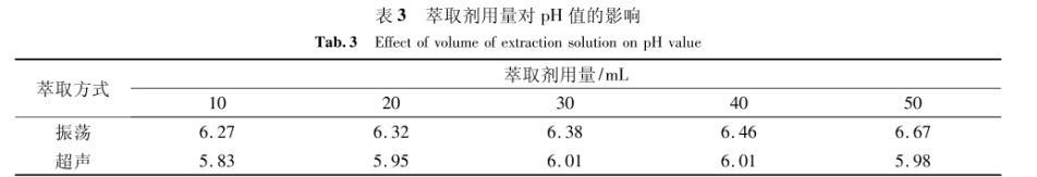 取選定的實驗用煙,在同樣的抽吸條件下得到的粒相物濾片,分別加入10,20,30,40,50 mL KCl水溶液,分別用振蕩和超聲的方式萃取30 min,測定其pH值,結果見表3.從表3的結果來看,在10——50 mL的范圍內,隨著萃取體積的增大,pH值也會增加,但增加到一定程度后變化不再明顯,根據節省試劑原則,選擇20 mL作為萃取劑萃取體積。