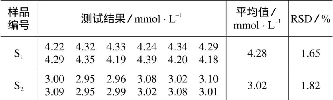 GB/T 12763.4–2007規定,測試海水總堿度使用的鹽酸標準溶液的標定方法是滴定法,即先配制0.010 0 mol/L的碳酸鈉標準溶液,然后以甲基紅–次甲基藍混合指示劑標定鹽酸標準溶液的濃度。甲基紅–次甲基藍指示劑在配制過程中加入了少量氫氧化鈉溶液,因此呈堿性,這樣會使標定的結果產生誤差。本法所使用的鹽酸標準溶液物質(GBW 08622)的標定方法是絕對測定法——精密庫侖法,可信度很高。另外經試驗表明,其均勻性和穩定性良好,這樣就保證了測試結果的準確性和可靠性。