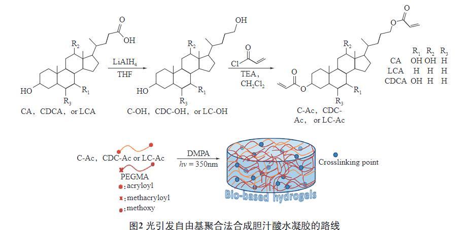 圖2光引發自由基聚合法合成膽汁酸水凝膠的路線