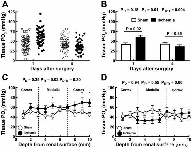 圖2、通過克拉克微電極評估組織PO2。首先將電極插入左腎皮層2毫米處的六個隨機位置。A:每只大鼠都進行了多次測量,不同的大鼠用不同的符號表示。封閉符號代表腎缺血大鼠(24小時內9只,5天內8只),而開放符號代表假缺血大鼠(24小時內10只,5天內7只)。B:每只大鼠皮層組織PO2的測量值取平均值,并以鼠間平均值SE表示。B中,PTr、PT和PTr*T是以治療(Tr)和時間(T)為因子的雙向方差分析(ANOVA)的結果。每對列上方的P值和誤差條顯示的是學生非配對t檢驗的結果,使用Dunn-Sidak校正k=2進行保守調整,以考慮在24小時和5天進行比較的事實。C和D:缺血或假缺血恢復后24小時(C)或5天(D),將電極從皮層表面以1毫米的增量推進到左腎10毫米處,建立組織PO2深度曲線。符號和誤差條是假缺血(○)或雙側腎缺血(實心○)1小時大鼠的平均值±SE。在C和D中,PD、PTr和PD*Tr是以深度(D)和治療為因子的雙向重復測量方差分析的結果。