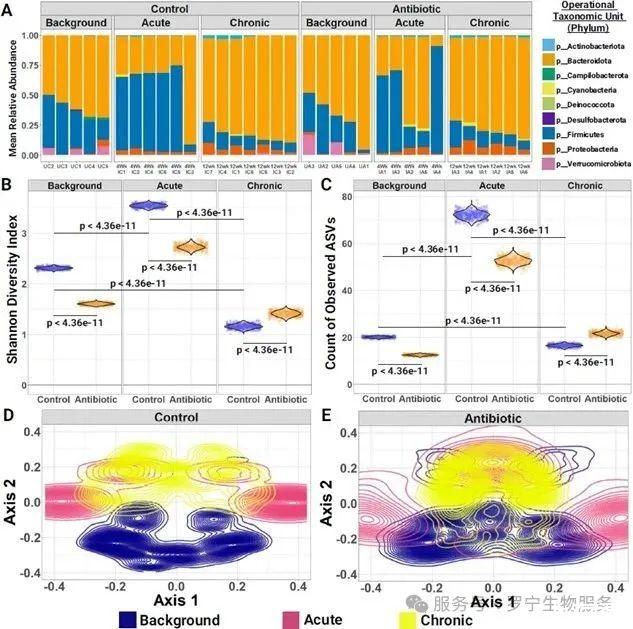 2、抗生素處理可降低植入相關菌群特征豐度并影響多樣性抗生素處理后腦組織中植入相關細菌顯著減少,尤其是來自腸道的序列在第4周降低27.8%。Shannon多樣性指數與ASV數量在植入早期顯著高于對照組,抗生素可有效降低其多樣性(見Fig.2B,2C)。PCoA分析中,抗生素組的腦組織樣本與背景組重疊更大,表明抗生素在一定程度上抑制了植入后細菌群落的獨特性(見Fig.2E)。