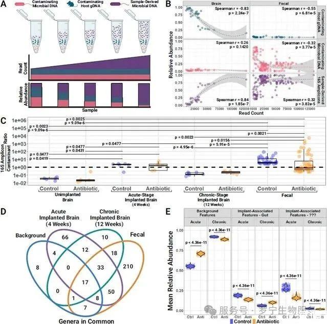 1、微電極植入導致細菌DNA入侵腦組織,且群落結構隨時間動態(tài)變化16S擴增子測序顯示,未植入腦組織中幾乎無細菌序列(16S/污染序列比值極低),而4周后腦組織中該比值顯著升高,提示細菌DNA明顯增多。12周時該比值下降,說明細菌入侵具有階段性(見Fig.1C)。同時,植入組中可檢測到189個新的菌屬特征,其中101個也在糞便樣本中出現,提示部分細菌來源于腸道(見Fig.1D,1E)。
