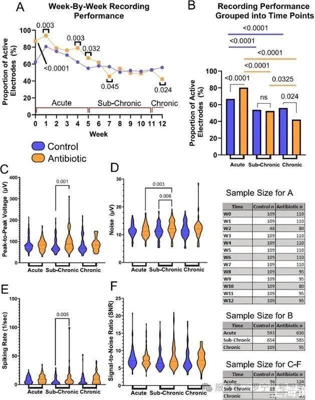 3、抗生素短期提升微電極性能,長期效果反轉電生理記錄顯示,抗生素組在急性期(0–5周)電極活性位點比例(AEY)顯著高于對照組(80%vs 67%,見Fig.3A–B),Vpp和spike rate指標也顯著提高(Fig.3C–E)。但在慢性期(第12周),抗生素組AEY下降至42%,低于對照組(56%),提示長期使用或影響腦組織狀態(tài)。