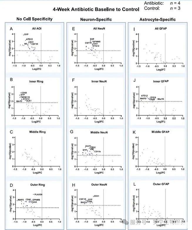 4、抗生素減少炎癥相關蛋白表達,緩解早期神經炎癥反應空間蛋白組顯示,抗生素組在植入第4周腦組織中有28個蛋白顯著下調,涉及微膠質細胞(如CD40、CD68)、自噬(ATG5、ULK1)及神經健康標志物(MAP2、NeuN)(見Fig.4)。12周時炎癥相關蛋白表達差異大幅減少,僅CD163在抗生素組中上調,提示免疫表型由促炎M1向抗炎M2轉變。