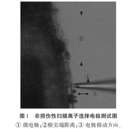 幼苗在測量前10 min轉移到裝有測試液(0.1mmol CaCl2,0.1mmol KCl,0.5 mmol NaCl,0.2 mmol Na2SO4,0.3 mmol MES,pH值5.8)的測試盒中平衡。測試時,將幼苗根系置于測試液中,用小玻璃塊將測試部位固定壓好。測量區域是位于距離根尖300~400 um的根系根毛區。將電極尖端置于距離根表10 Lm處作為原點,在垂直于根表面的方向進行兩點移動,測量兩點電壓差,兩點移動距離為30 Lm(如圖1)。每個樣品穩定測量10 min。