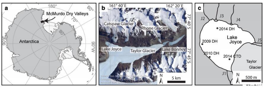 圖1、南極麥克默多干谷(a)含有多年冰蓋湖泊,如喬伊斯湖(b)。喬伊斯湖緊鄰泰勒冰川,由季節性融水溪流供水(c)(術語來自Green等,1988)。圖中2010年湖泊輪廓顯示水柱采樣點及用于采集疊層石和微生物墊的潛水孔(DH)位置。