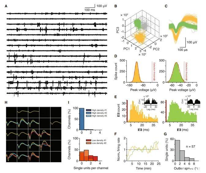 通過主成分分析可從低密度微電極陣列記錄中分離出單細(xì)胞神經(jīng)元,其波形聚類純凈、放電率穩(wěn)定,且低密度陣列單細(xì)胞分離成功率(62%通道)顯著高于高密度陣列(2%)。