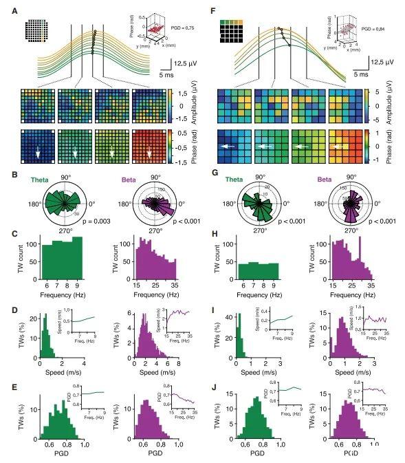 人類頂葉聯(lián)合皮層在視覺刺激后出現(xiàn)振蕩活動(dòng)的傳播波,θ波段(6–9 Hz)和β波段(15–35 Hz)的傳播方向具有頻段特異性,且隨頻率升高傳播速度加快(θ波段平均0.57 m/s,β波段平均2.40 m/s),相位梯度擬合平面模型的擬合度較高。