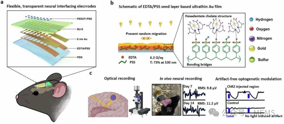 圖1應用于電-光神經(jīng)接口的基于EDTA/PSS聚合物種子層的超薄金μECoG電極陣列示意圖