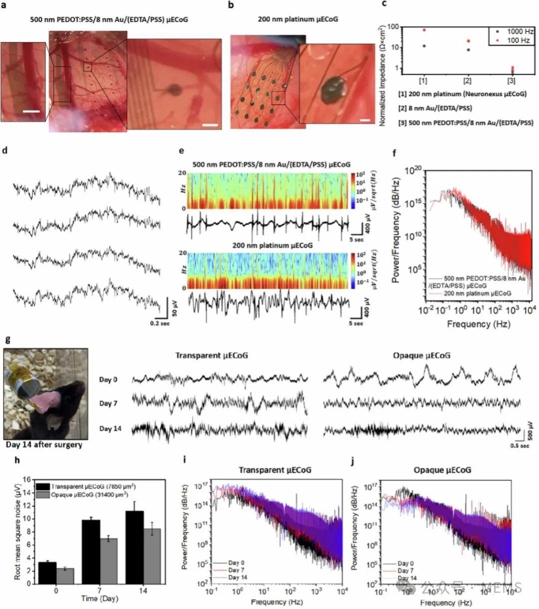 為了驗證透明μECoG電極陣列在體內(nèi)的長期穩(wěn)定性和記錄性能,研究人員使用透明和不透明的μECoG電極陣列進行了為期2周的記錄實驗(圖5g)。結果表明,兩種μECoG電極陣列都顯示出穩(wěn)定的腦電波記錄性能,即使在2周后,均方根(RMS)噪聲水平的下降也非常小。