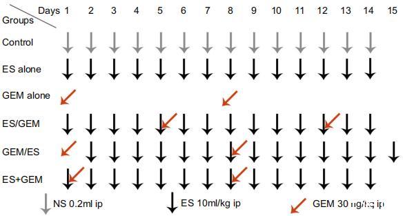 LLC接種10天后,將腫瘤小鼠隨機分為對照組、單用Endostar(ES)組、單用吉西他濱(GEM)組、先用Endostar組(ES/GEM)、先用吉西他濱組(GEM/ES)、Endostar和吉西他濱同時使用組(ES+GEM)(n=12,每組)[圖1]。簡言之,i)對照組(陰性對照)不作任何處理;ii)單用ES(10毫克/千克/天,14天);iii)單用GEM(30毫克/千克/天,第1天和第8天給藥);iv)ES/GEM(Endostar在第1-14天給藥,吉西他濱在第5天和第12天給藥);v)GEM/ES(第2-15天服用Endostar,第1天和第8天服用吉西他濱);vi)ES+GEM(第1-14天服用Endostar,第1天和第8天服用吉西他濱)。每兩天用卡尺測量一次腫瘤體積,腫瘤體積按以下公式計算:V=?ab2(其中V為腫瘤體積,a為主軸長度,b為次軸長度)。治療結束后,小鼠被處死。