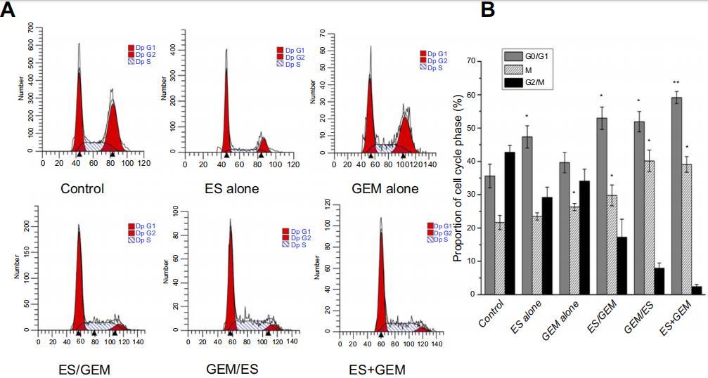 治療結束后,流式細胞術評估了各治療組的腫瘤細胞周期(圖5)。與對照組(21.64%,P<0.05)相比,單用GEM治療組處于合成期(S)的細胞比例(26.3%)略有增加。而與對照組(35.63%)和單用GEM組(39.63%)相比,單用ES組細胞周期分布中專門用于細胞分裂準備的G0/G1期顯著增加(47.35%,P<0.05)。特別是,與對照組相比,ES+GEM組的G0/G1期(59.16%)和S期(39.09%)比例最高(P<0.01)。