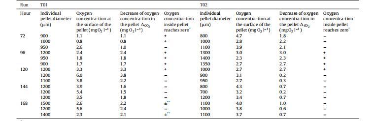 對于在T02試驗中獲得的結構松散的稍小顆粒,只有少數顆粒內部的氧濃度降為零。而在T01試驗中獲得的結構更緊湊的較大顆粒中,在不同培養時間測試的15個顆粒中有8個的氧氣濃度為零。此外,在T01試驗的顆粒中,從顆粒表面到中心的氧氣濃度(CO2)下降幅度(平均為1.9毫克O2/l)高于T02試驗的顆粒(平均為1.3毫克O2/l)。