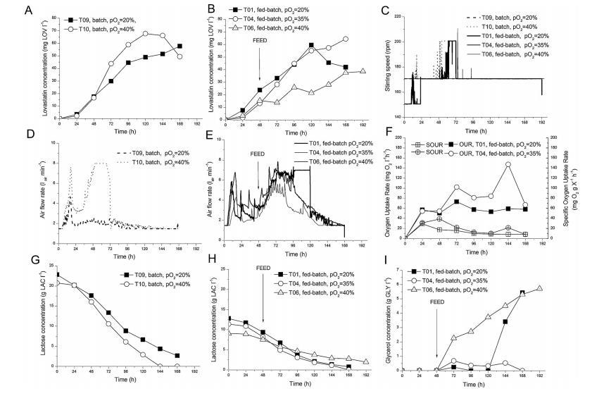 值得注意的是,與運行T09相比,分批運行T10對氧氣的需求要高得多,在該運行中,洛伐他汀的生產率很高,氧飽和度被控制在40%的最高水平(圖1D)。在所有運行的早期滋養階段(12小時左右)以及分批補料運行T01和T06中(pO2控制在40%),氧氣吸收率非常高,以至于達到了空氣流速的上限,因此攪拌速度增加了(圖1C)。