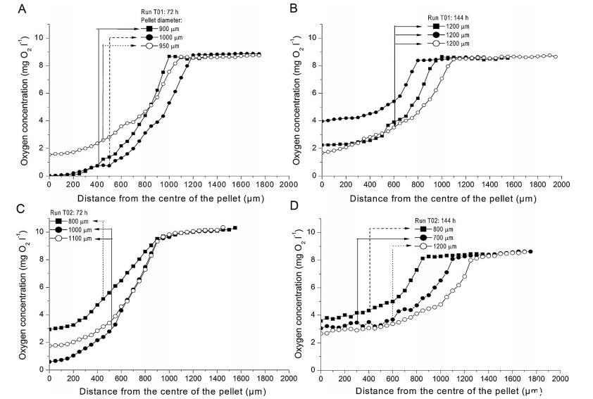 圖2、生產培養基顆粒中的顆粒內氧濃度曲線:(A)T01運行72小時后;(B)T01運行144小時后;(C)T02運行72小時后和(D)T02運行144小時后;帶箭頭的垂直線代表顆粒表面;這樣,邊界層中的氧濃度梯度與顆粒內的梯度就區分開了。