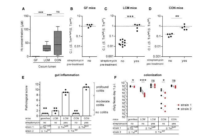 無菌小鼠腸道:氫氣幾乎為零(<2μM),沙門氏菌無需搶奪氫氣也能生長(zhǎng)(突變菌與正常菌無競(jìng)爭(zhēng)差異)。