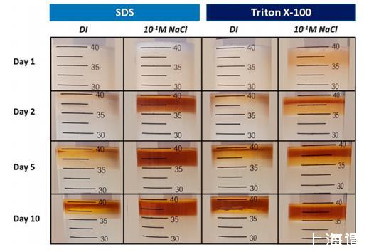 視覺觀察。在不同表面活性劑和鹽度水平下的視覺觀察表明,NaCl和表面活性劑類型都對水包油乳液的穩定性有顯著影響。在制備了具有不同表面活性劑和NaCl濃度的各種乳液樣品后,觀察了乳液樣品在10天內的穩定性(圖1)。