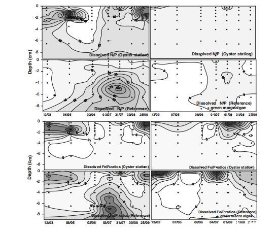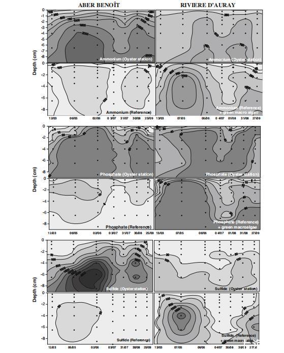 硫化物(HS?)濃度兩區域差異顯著(圖8)。阿伯貝努瓦河牡蠣點下方6月達4,475 μmol l?1(7 cm深度),8月達2,792 μmol l?1(4–7 cm深度),參考點<70 μmol l?1。奧雷河牡蠣點下方<500 μmol l?1,參考點5月達2,415 μmol l?1(4–5 cm深度)。水體中未檢出硫化物。