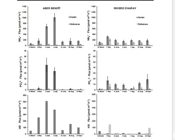 硫化物通量在阿伯貝努瓦河牡蠣點下方5月、7月、8月顯著增加(達510 μmol m?2 h?1),參考點近零。奧雷河牡蠣點通常較高(達50 μmol m?2 h?1),但5月、9月參考點更高(148、96 μmol m?2 h?1)。