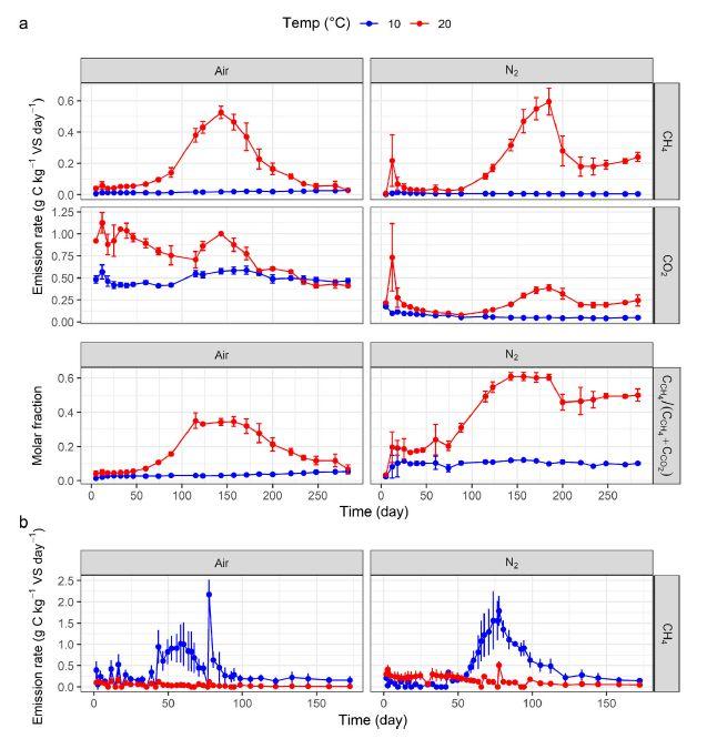 圖3、(a)豬糞貯藏實驗中CH4和CO2及其摩爾分數的排放率,以每瓶貯藏實驗開始時的揮發性固體(VS)質量歸一化。將糞便在10°C(紅色)或20°C(藍色)下與空氣或N作為頂空交換氣體一起孵育。(b)貯藏實驗后厭氧消化階段的CH排放率。在厭氧消化過程中,所有處理均在38°C下與頂空N一起孵育,顏色是指在儲存實驗期間之前孵育的溫度(紅色=20°C,藍色=10°C)。數據以平均值±標準差(n=4)表示。