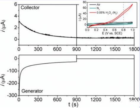 在集電極處每分子O?還原的整體電子計數(shù)為3的觀察結(jié)果,引發(fā)了在水的氧化實驗過程中H?O?可能對在發(fā)生器電極觀察到的陽極電流有貢獻(xiàn)的可能性。為研究這種可能性,在空氣飽和溶液中進(jìn)行了一項C-G實驗,如圖5所示。在此情況下,F(xiàn)TO發(fā)生器在0至900 s期間置于-0.85 V vs SCE以進(jìn)行O?還原,并在900至1800 s期間置于0 V vs SCE。FTO集電極在整個實驗期間置于0.8 V vs SCE以感應(yīng)H?O?。如圖5插圖所示,使用FTO工作電極記錄的CV顯示,在存在H?O?時,0.8 V vs SCE處的陽極電流比在空氣或缺乏H?O?的N?飽和溶液中有所增加。重要的是,在實驗過程中未觀察到FTO集電極處陽極電流增加,這表明如果H?O?在O?還原過程中形成,它不會對在對電極觀察到的電流有貢獻(xiàn)。