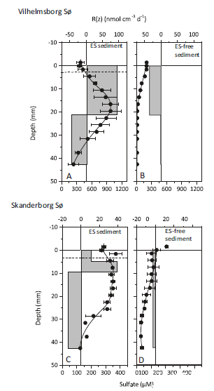 圖3、Vilhelmsborg S?(a,b)和Skanderborg S?(c,d)的ES沉積物和無ES沉積物中的硫酸鹽還原率(灰色條)和硫酸鹽濃度(黑點)。誤差線表示平均值的標準誤差(n=3)。a和c中的虛線表示含氧區的下邊界。