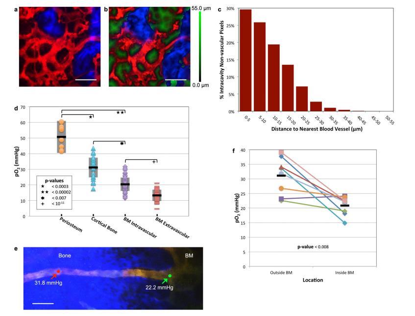 使用軸向疊層,按照之前的方法計算出每個pO2測量值到最近的骨表面(骨膜)的距離。簡言之,利用勾股定理確定三維空間中到骨膜的最短距離。使用羅丹明B右旋糖酐信號測量血管直徑。該測量僅在x-y平面上進行,是血管腔的直徑。距離和血管直徑的測量均在ImageJ v.1.47p中進行。為便于顯示,調整了圖1a-b、1e、4a-b、擴展數據圖4、6和7以及擴展數據視頻1的亮度和對比度。所有圖像分析均在原始圖像上進行。在圖1a中,顯示的最大強度投影圖像僅包括藍色通道中約23μm的深度。我們沒有包括藍色通道的整個厚度,因為在最淺的深度,骨SHG信號覆蓋了圖像的大部分。